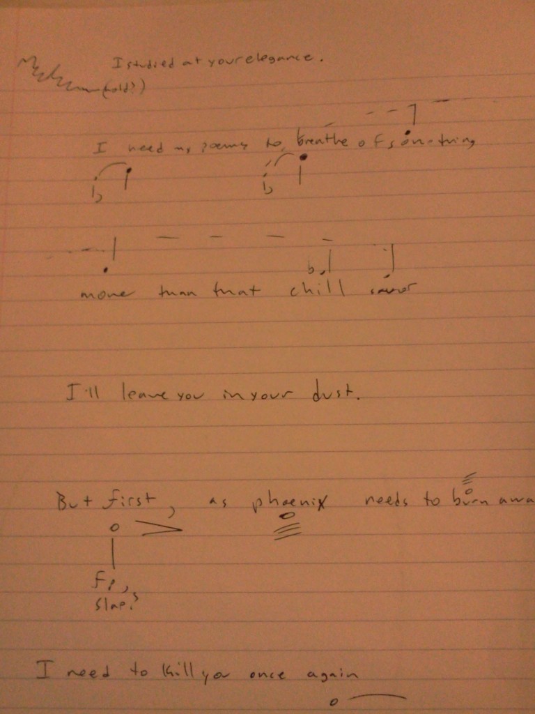 Here’s my first sketch with actual noteheads in it for Poems Without Names. I can’t believe that this piece is going to be done and performed on St. Patrick’s day. I’m using a lot of the same techniques from The Seafarer and from The Lovesong of J. Alfred Prufrock, but instead of a solo performer, I’ve got a poem with a duet.