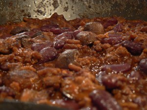 If you want to eat it right now, go ahead. It’ll be spicy and have plenty of sweetness leftover from the gochu chang, and you’ll taste the caramelized onions binding everything else in the dish together. If you want to let it simmer for a while (adding water if it gets too dry) you’ll find that the oniony flavor melts away and you get more a chili/spice/beef flavor. Even longer on the heat (total an hour?) and you’ll taste more of the beans up front, with layers of spice and the other ingredients behind it. After that I don’t know because I was hungry, and served it over rice.